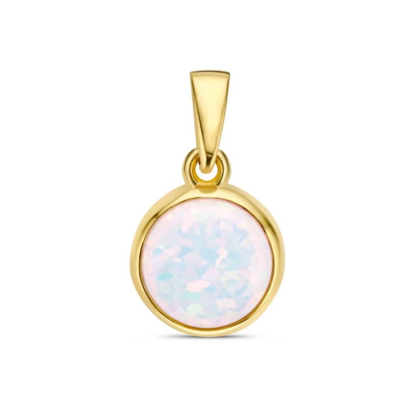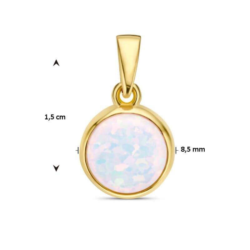 Kleine ronde hanger gemaakt van 14 karaat geelgoud en uitgevoerd met een schitterende witte opaliet, een prachtig kleurenspel! De hanger heeft een totale hoogte van 15 mm, de ronde kast met opaliet heeft een diameter van 8,5 mm. De opaliet is cabochon geslepen en zetkast gezet. Het metaalgewicht is circa 0,88 gram.