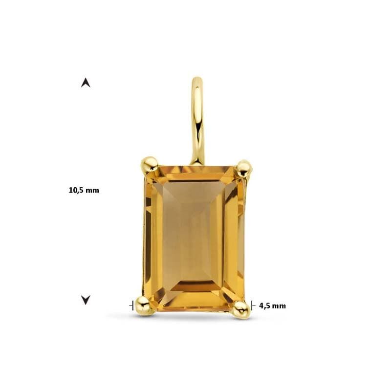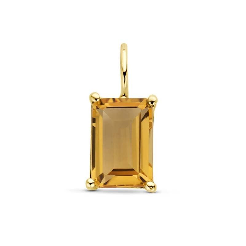Deze prachtige 14 karaat geelgouden hanger uit de Home Collectie is een verfijnde toevoeging aan elke sieradencollectie. De hanger is voorzien van een schitterende citrien in baguette slijpvorm, met een hoogte van 6 mm en een breedte van 4 mm. De helder gele kleur van de citrien vangt het licht op een elegante manier en straalt warmte uit. De steen is stevig gezet in een klassieke chatonzetting met vier pootjes, waardoor de hanger zowel stijlvol als veilig is.