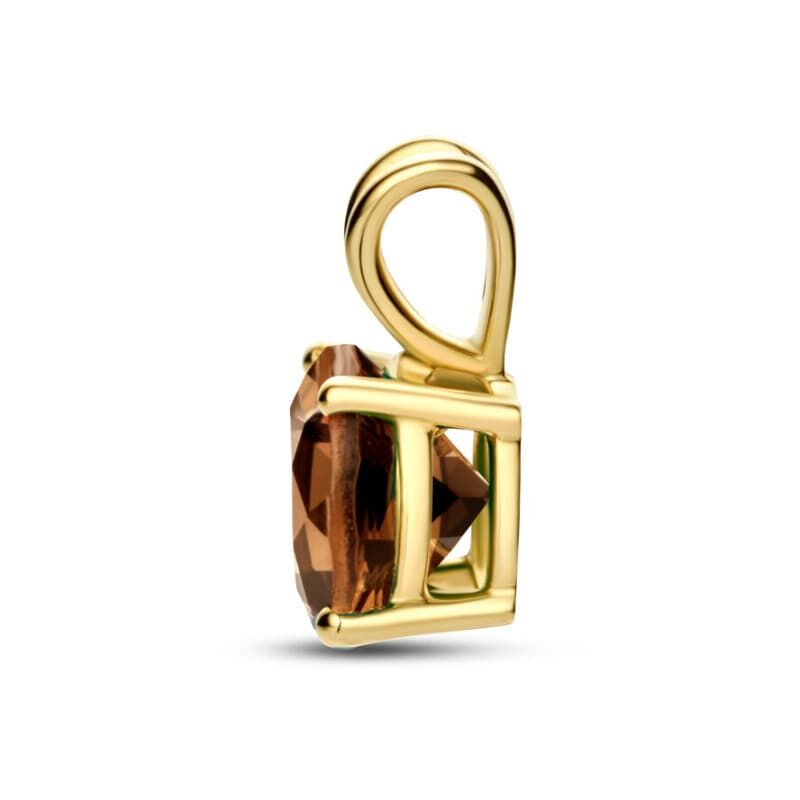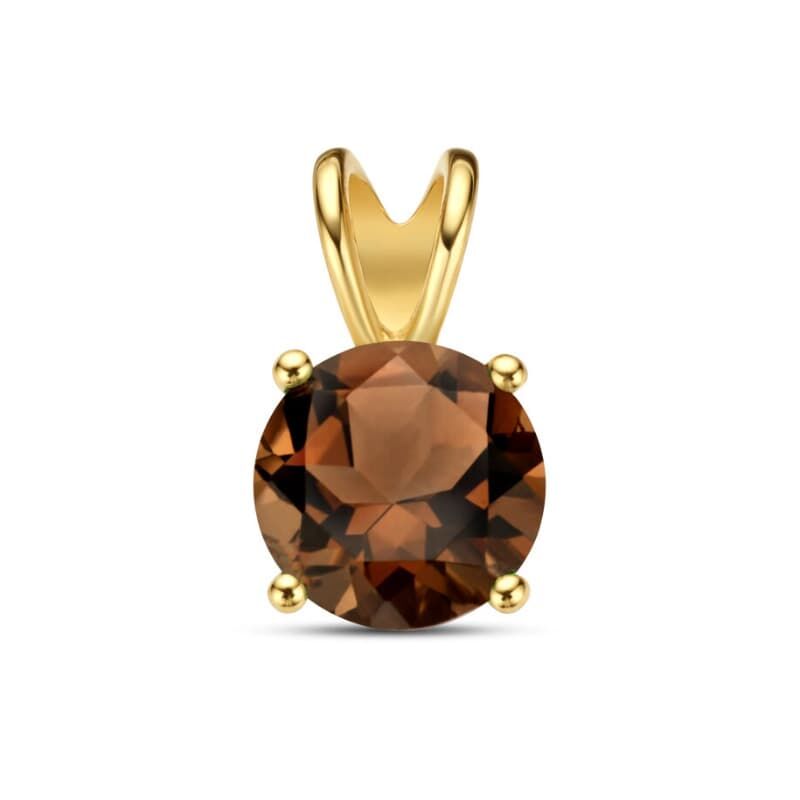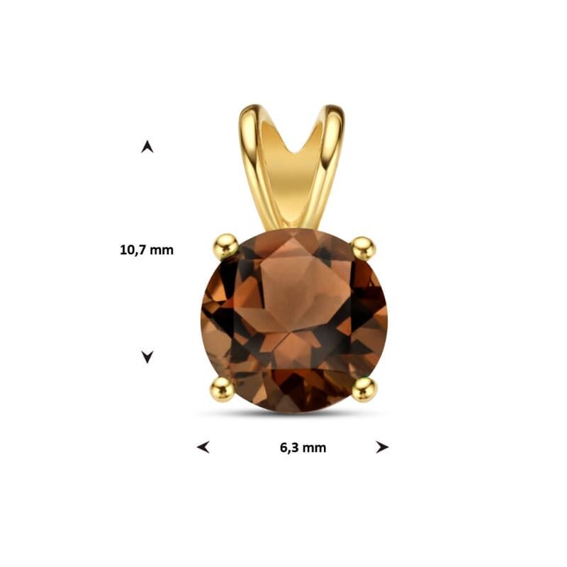 14 Karaat gouden hangertje bezet met rookkwarts, nieuw in geschenkverpakking. Mooi gouden hangertje met een rookkwars van 0.50ct in een chaton gezet. De diameter van de gouden hanger is 6,3 mm.