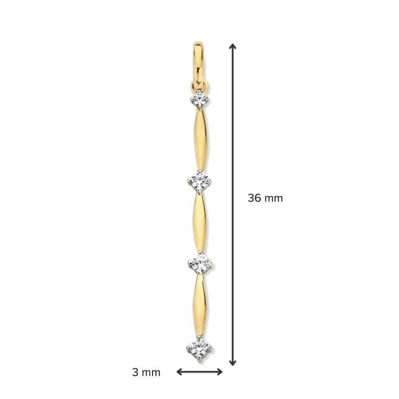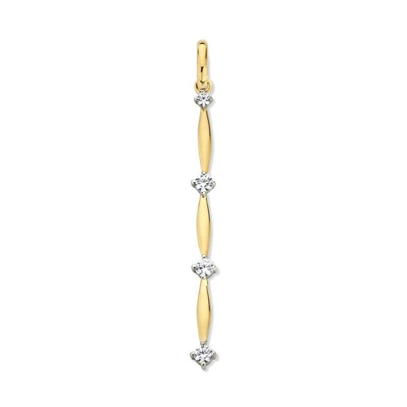 Deze 14 karaat geelgouden hanger van Excellent Jewelry kenmerkt zich door een slank en verticaal ontwerp met een totale lengte van 3,5 centimeter. Het sieraad is vervaardigd uit hoogglans gepolijst goud en weegt 0,7 gram. De opbouw bestaat uit een opeenvolging van fijne gouden elementen en vier heldere zirkonia.