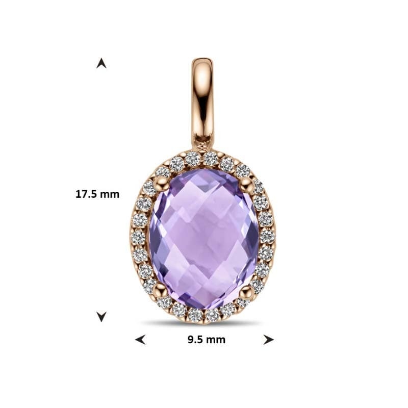 Voeg een vleugje verfijning toe aan uw sieradencollectie met deze 14 karaat roségouden hanger, waarin de schoonheid van amethist en diamant tot leven komt. Met een afmeting van 17 x 9,5 mm combineert de hanger elegante proporties met een schitterende uitstraling. In het hart van het ontwerp schittert een facet geslepen amethist in een diepe paarse tint, stevig verankerd in een klassieke chatonzetting met 4 pootjes. Afmeting van de amethist is 9 x 7 mm.