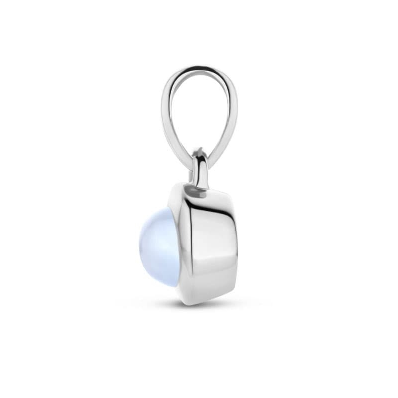 De hanger heeft rondom een gladde witgouden rand waarin de steen is gevat. De lichtblauwe chalcedoon is aan de bovenzijde bol geslepen, waardoor de kleur en textuur van de steen duidelijk zichtbaar zijn. Aan de bovenzijde van de ronde zetting is een klein oogje gesoldeerd dat het grotere, taps toelopende hangoog draagt. Dit hangoog is aan de binnenzijde glad afgewerkt zodat de hanger soepel over een ketting glijdt.
