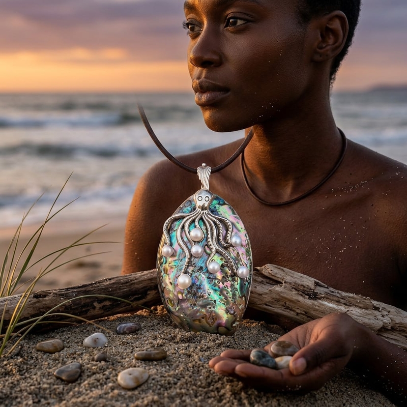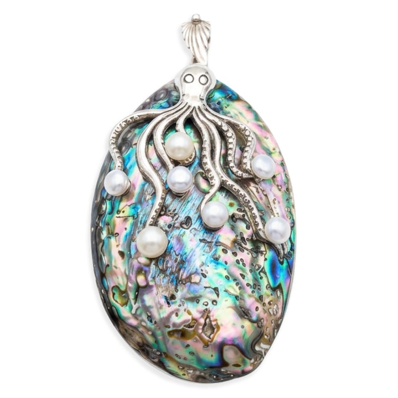 Deze forse hanger van 9,5 cm lang is opgebouwd rond een kleurrijke, ovale abalone schelp van 8 bij 5 cm met daarop een octopus van 5 bij 4 cm. Het sieraad beschikt over een hangoog dat is bewerkt met een streeppatroon. Aan zeven van de acht tentakels van de octopus is een witte zoetwaterparel verbonden die over de voorzijde van de schelp valt.