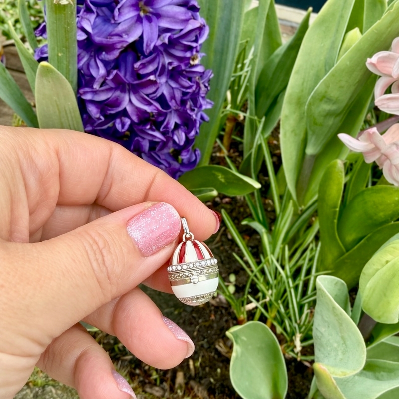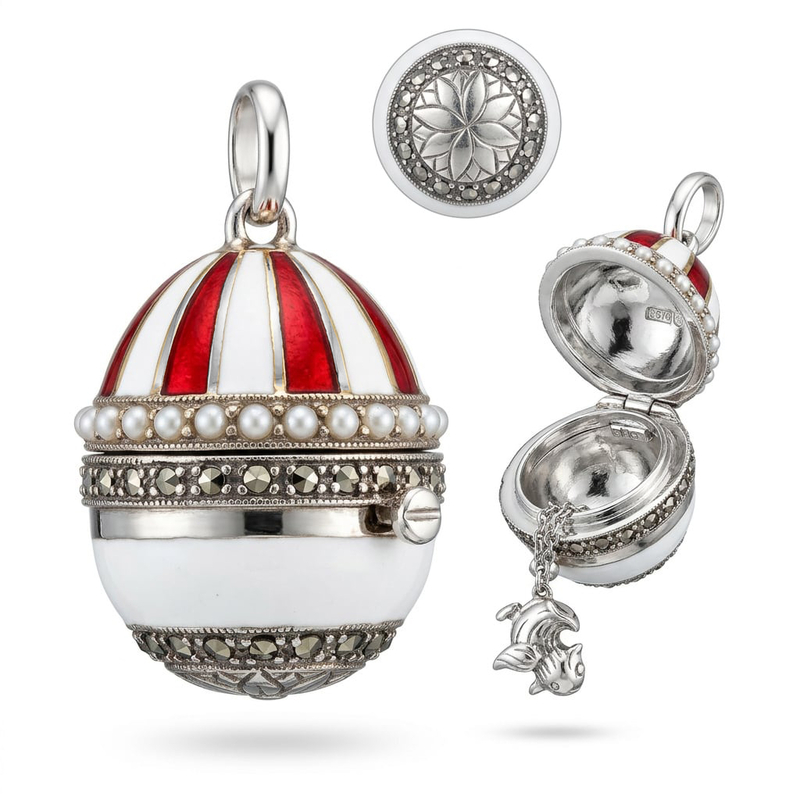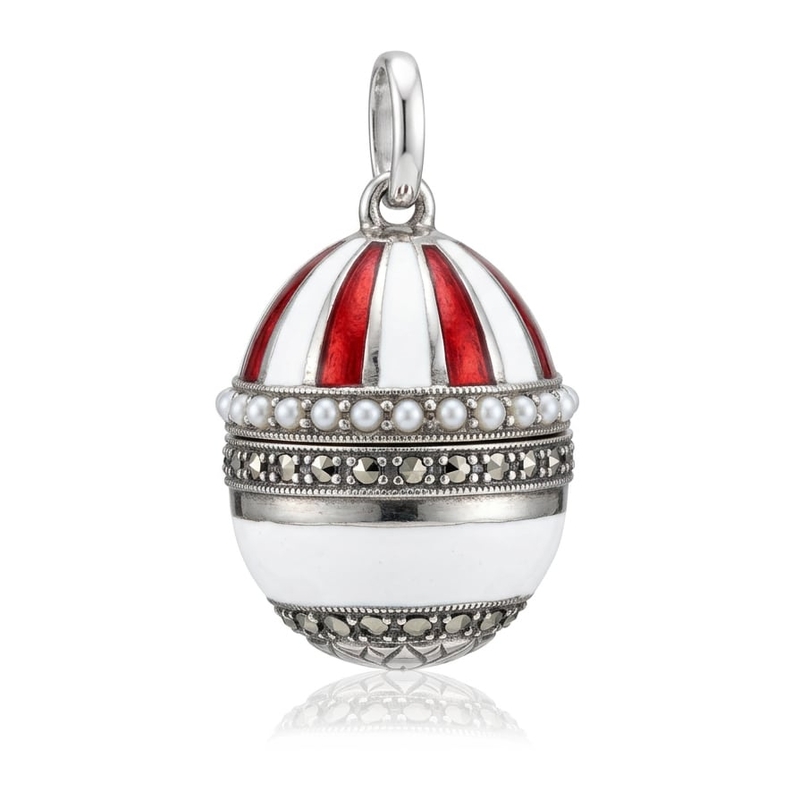 Dit verfijnde 1e gehalte zilveren hangertje is vormgegeven als een klein sierlijk ei dat open kan. De bolvormige hanger is gedecoreerd met banen rood en wit email, waardoor het ei een levendige en bijna koninklijke uitstraling krijgt. Rond de middenband loopt een rand van kleine pareltjes, gevolgd door een tweede decoratieve band bezet met markasietjes, die het zilver een subtiele, sprankelende glans geven.