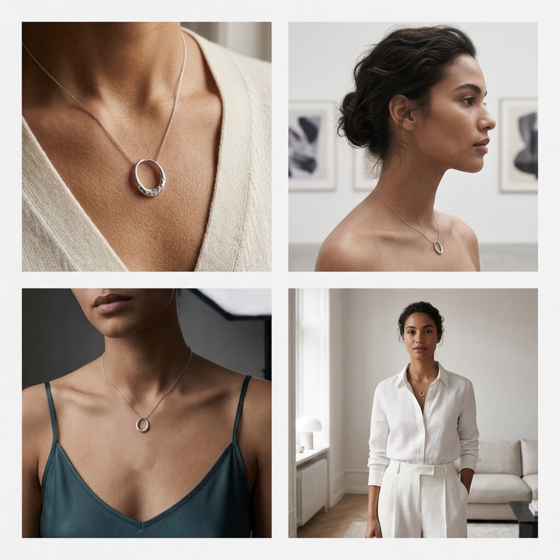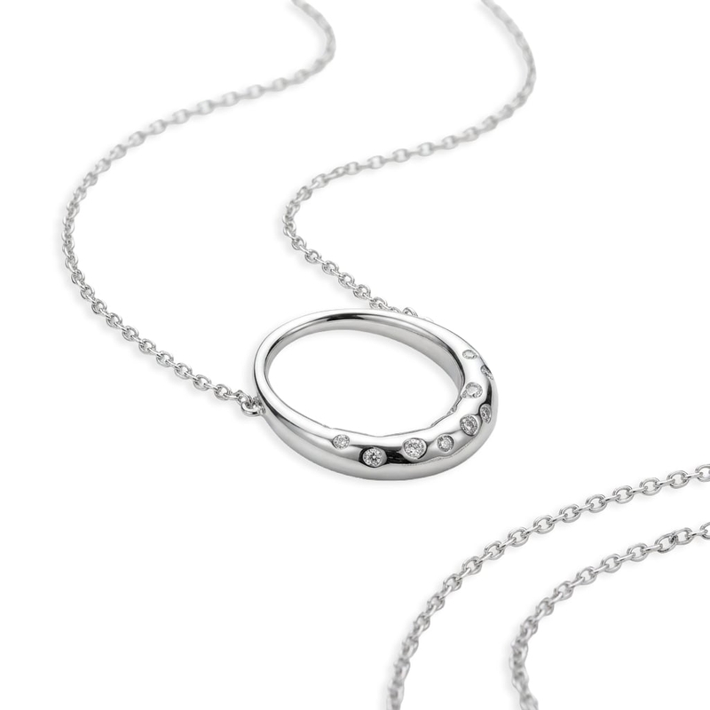 De opengewerkte hanger heeft een vloeiende, eivormige lijn waarbij de briljant geslepen diamantjes in het onderste deel van het sieraad zijn gezet. Dit motief symboliseert de kracht van menselijke relaties. De ketting loopt direct door de bovenzijde van het ornament.
