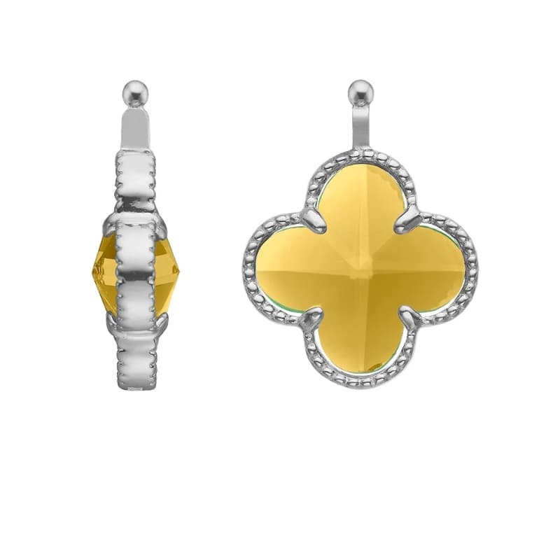 Heide Heinzendorff aanhangers in de vorm van een klaver. Leuke klaver aanhangers met geel glas. De aanhangers zijn verkrijgbaar met een zilver of een verguld zilver montuur. U ontvangt de aanhangers in cadeauverpakking.