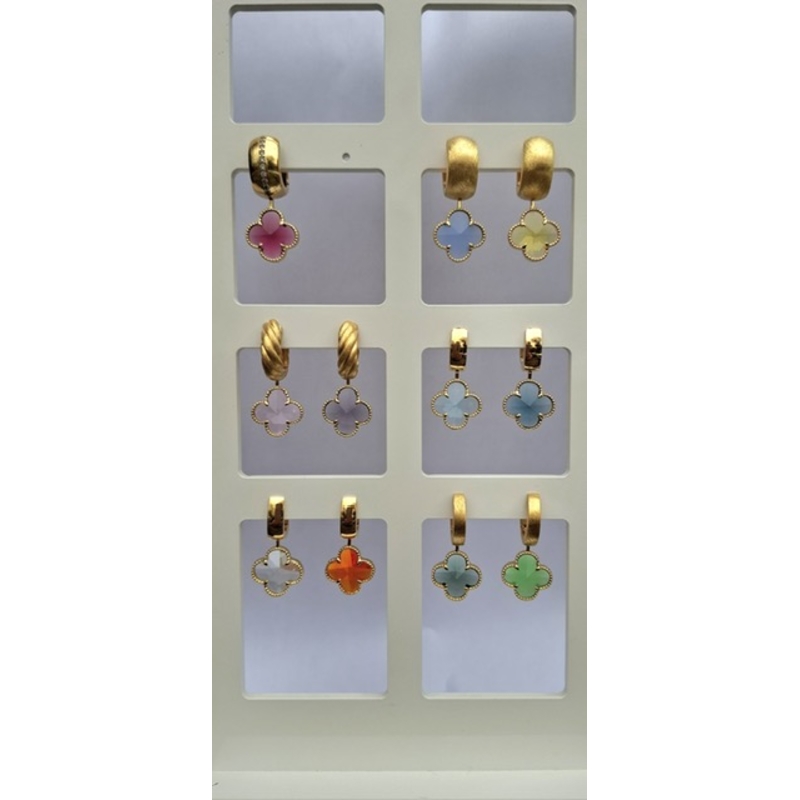 Je kunt deze klaver aanhangers krijgen met een zilver montuur of met een verguld zilver montuur. Zo kies je eenvoudig de kleur die het beste aansluit bij jouw oorringen uit de Heide Heinzendorff wissel systeem collectie.