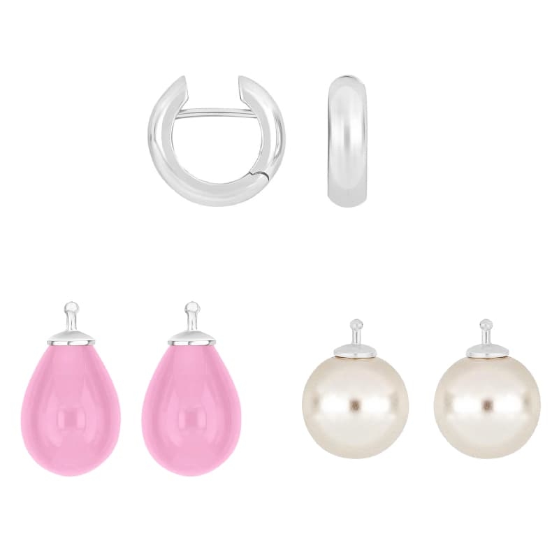De oorringen hebben een glad, hoogglanzend oppervlak en een moderne, afgeronde vorm die mooi rond het oor sluit. Met één eenvoudige wissel verandert u de uitstraling: van minimalistisch zonder hanger naar speels met de roze druppels, of klassiek en rustig met de witte crystal parelaanhangers.