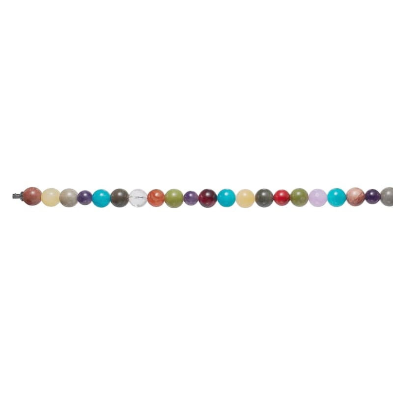 Deze systeemketting is gemaakt met een mooie mix van edelstenen: bergkristal (bergkwarts), jaspis, amethist, tijgeroog en jade. Door de verschillende kleuren en glansjes ziet de ketting er levendig en opvallend uit. Een fijne keuze als je houdt van sieraden die direct in het oog springen, maar toch stijlvol blijven.