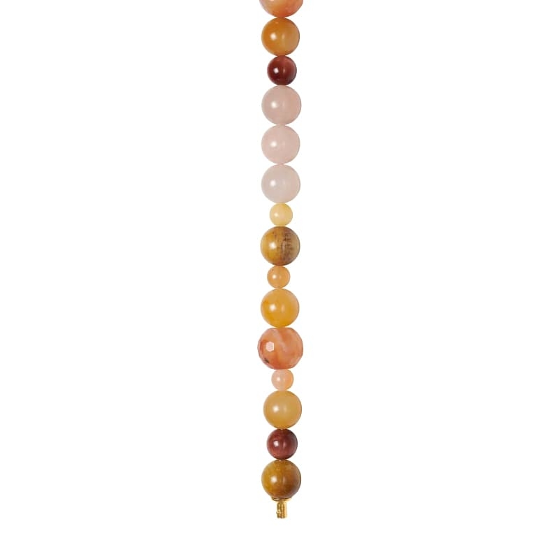 Deze edelstenenketting is gemaakt van aventurijn, jade, agaat en tijgeroog. De warme, zonnige kleuren geven je outfit meteen meer karakter. Met stenen tot 12 mm is de ketting opvallend, maar nog steeds comfortabel om te dragen.
