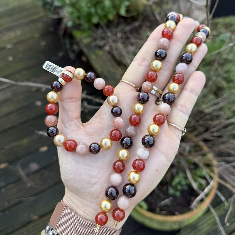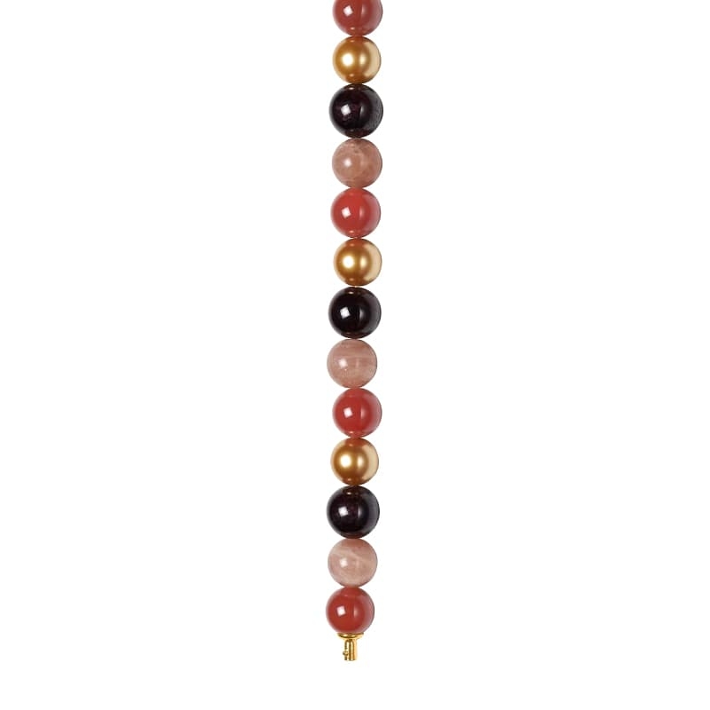 Dit elegante snoer met zonnesteen, carneool, granaat en parelmoer komt uit de systeemkettingen collectie van Heide Heinzendorff. De kralen zijn ongeveer 10 mm groot en elke steen is net even anders. Dat maakt dit sieraad extra bijzonder: de kleur en tekening verschillen per kraal, waardoor u altijd een uniek snoer draagt.