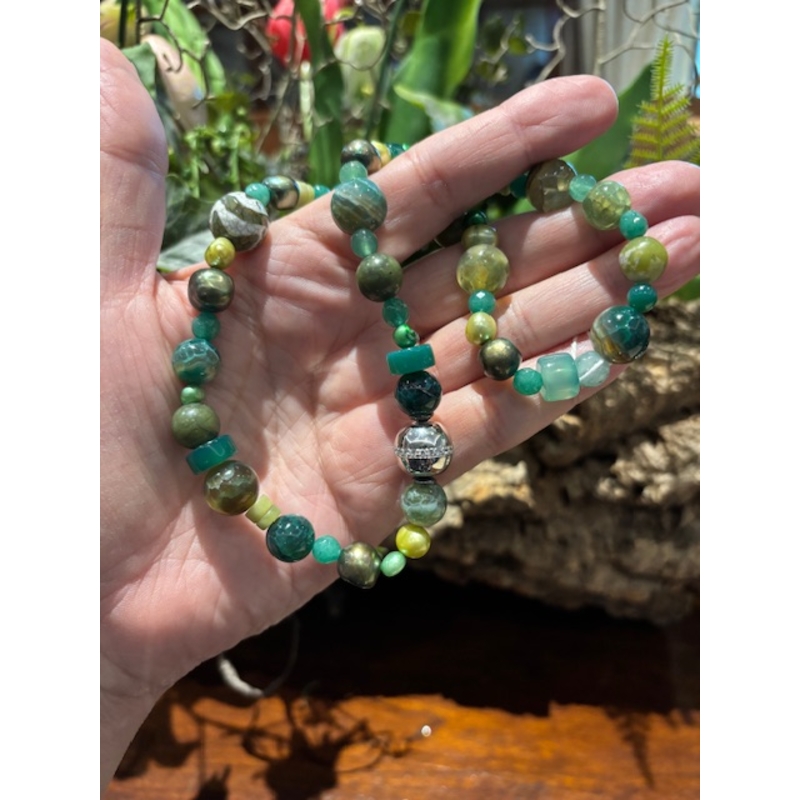 De armband is gemaakt van agaat, kwarts en jasper, met een verguld sterling zilveren tussenstuk. Dat kleine detail maakt de armband extra bijzonder en geeft hem een nette, luxe afwerking. Een echte blikvanger die je makkelijk elke dag kunt dragen.
