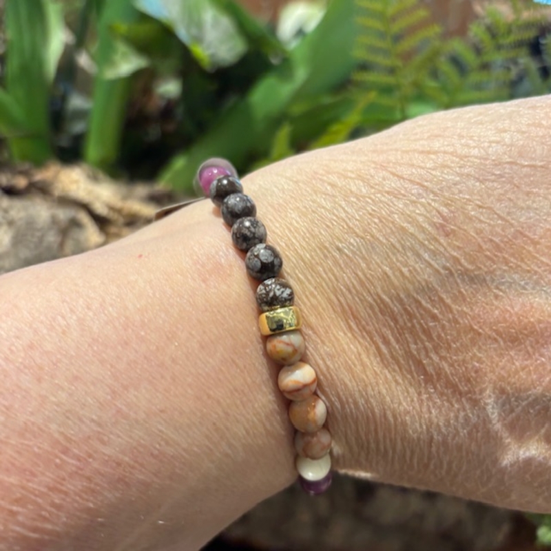 Het armband bestaat uit jasper, sponskwarts en hematiet. Tussen de stenen zit een tussen element van verguld sterling zilver. Dit zorgt voor een luxe detail en geeft de armband net dat beetje extra uitstraling.
