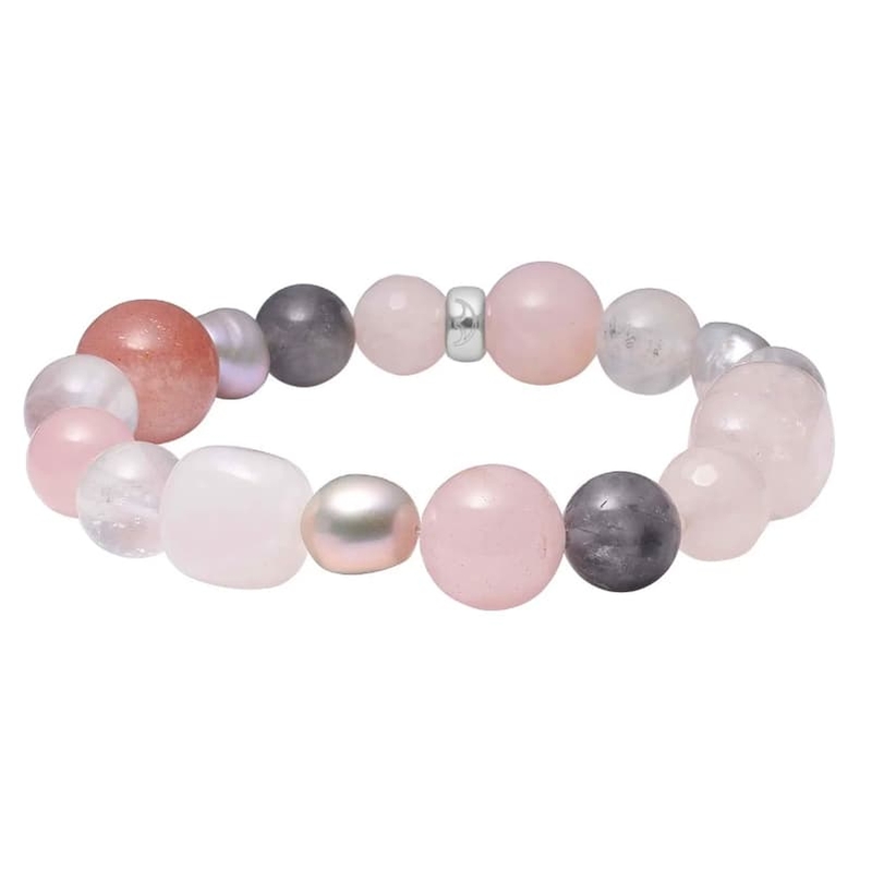 De armband bestaat uit rozenkwarts, grijs kwart en zonnesteen. Samen zorgen ze voor een fijne mix van zachte en warme kleuren. Daardoor draag je hem moeiteloos dagelijks, maar hij past ook perfect bij een diner, feestje of andere speciale gelegenheid.