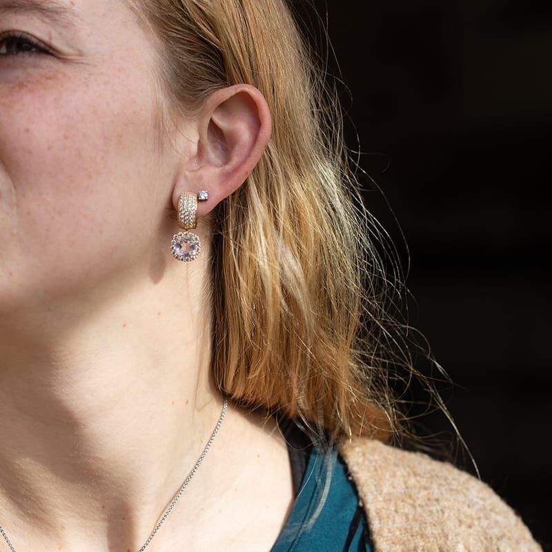 De aanhangers zijn gemaakt voor het kenmerkende wisselsysteem waarmee je met één klik een andere look creëert. Het facetgeslepen kwartsglas vangt het licht, terwijl de kleine, transparante kristallen in pootjeszetting voor een verfijnde omlijsting zorgen.