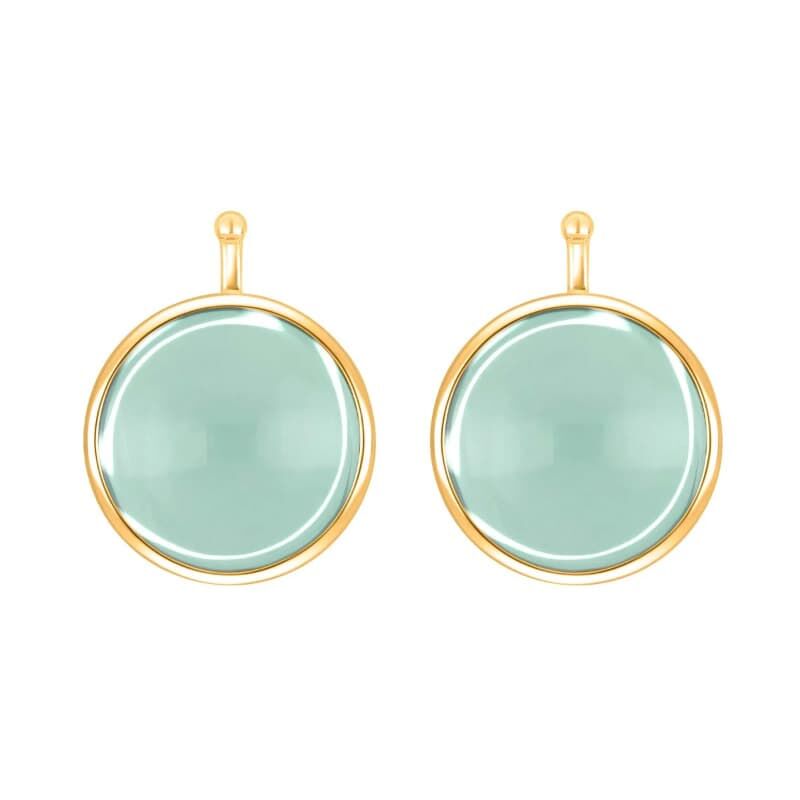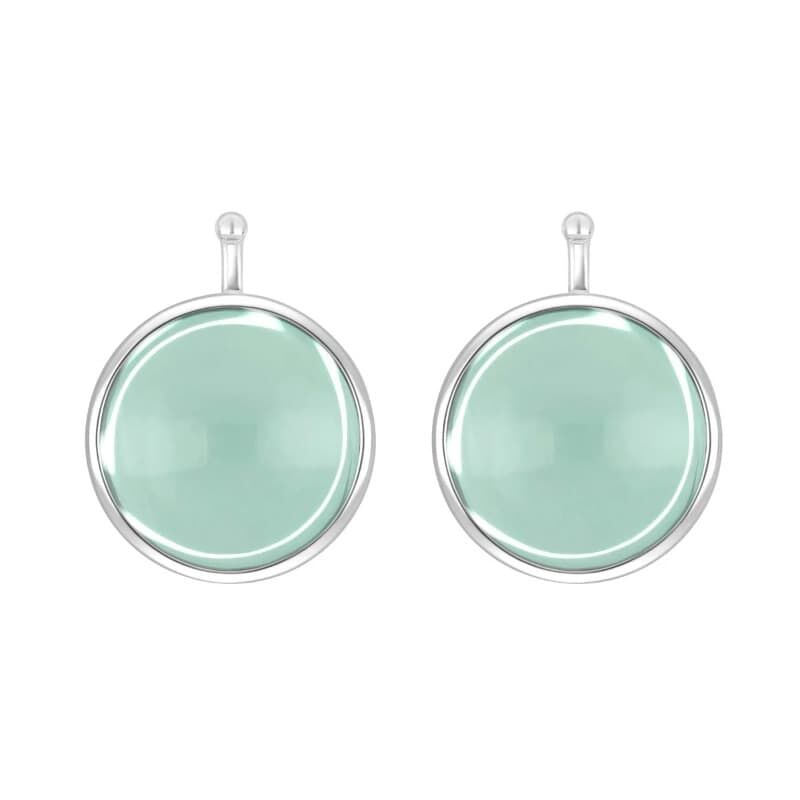 Prachtige zilveren ronde aanhangers in model E73 kleur 47 bezet met bol geslepen glas in de kleur lichtgroen uit de collectie van Heide Heinzendorff. De combinatie van mooi cabochon geslepen glas, gezet in een open zilveren omlijsting, de achterkant is hetzelfde als de voorkant, creëert een elegante en luxueuze uitstraling die ongetwijfeld indruk zal maken.
