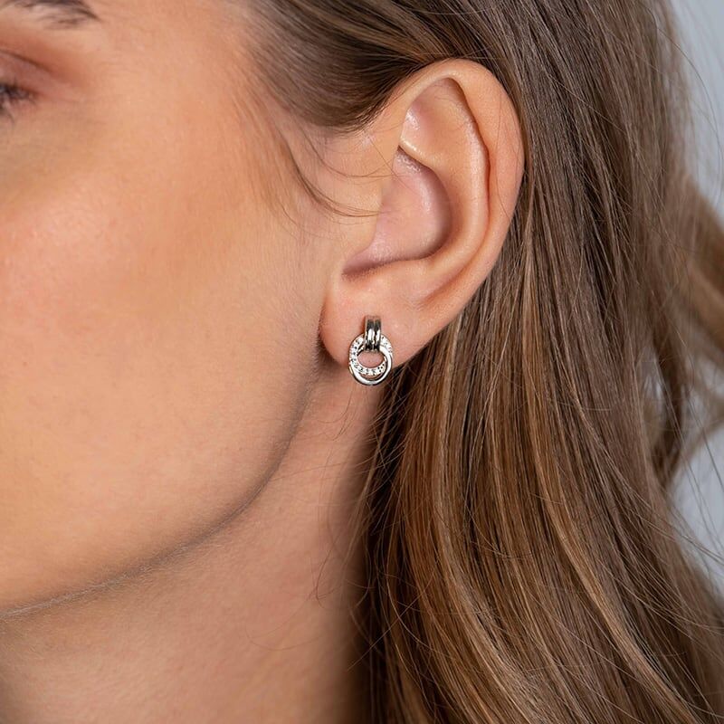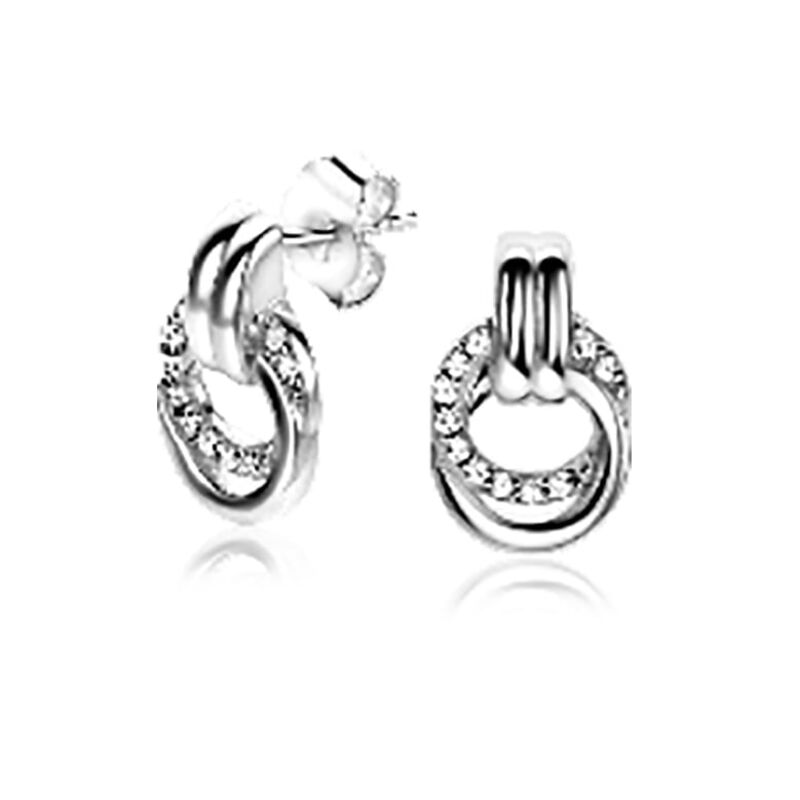 Ronde zilveren oorbellen Verbonden, ZIO2266 uit de collectie van Zinzi, nieuw in geschenkverpakking. Twee verbonden open rondjes, de ene glad, de andere bezet met witte, schitterende zirkonia's, gemaakt van 1e gehalte zilver.