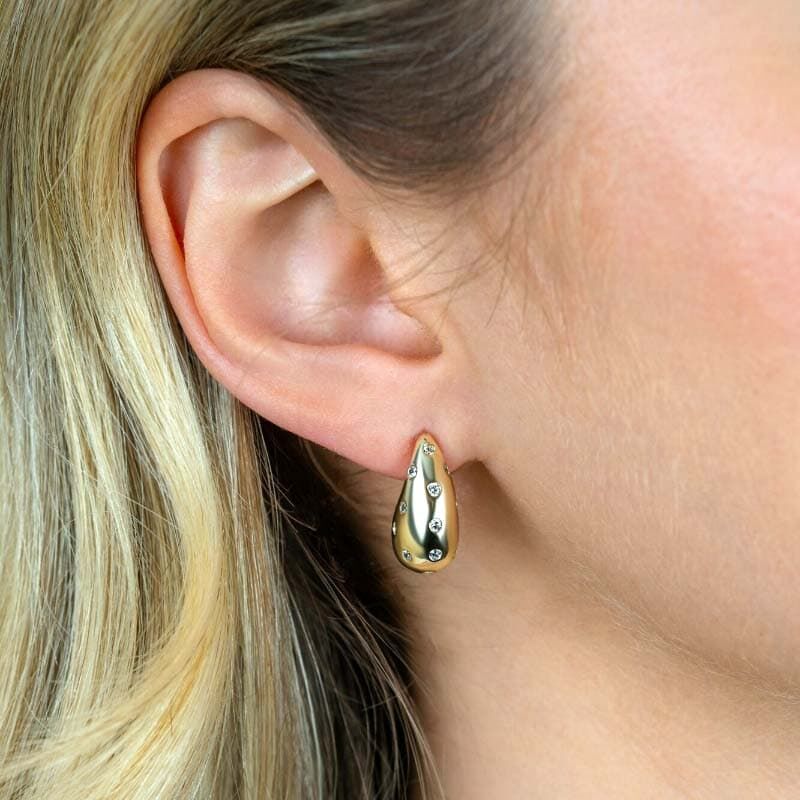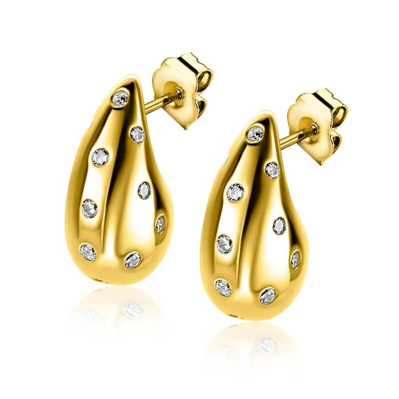 De set wordt compleet gemaakt door de bijpassende zilveren oorstekers in dezelfde elegante druppelvorm. Ook zij zijn voorzien van sprankelende witte zirkonia’s en hebben dankzij de geelvergulde afwerking net dat beetje extra flair. Met hun gewicht van circa 5,3 gram draag je ze moeiteloos de hele dag door. Hun formaat – 17,3 x 10,7 x 8,8 mm – maakt ze goed zichtbaar zonder overheersend te zijn.