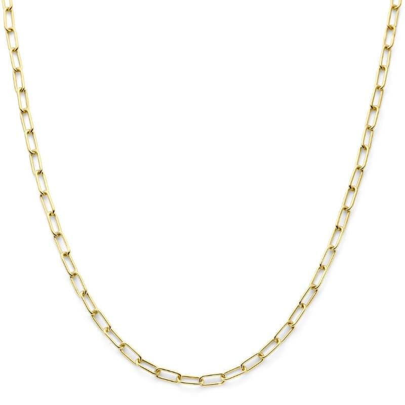 Het collier is uitgevoerd in een anker schakeltype. Dankzij de schakelbreedte van 4.7 mm voelt het solide aan op de hals en ligt het mooi vlak. De lengte zonder extensie is 45 cm, een fijne maat die vaak net mooi op het sleutelbeen valt.