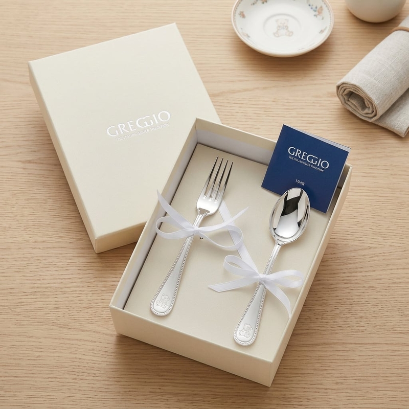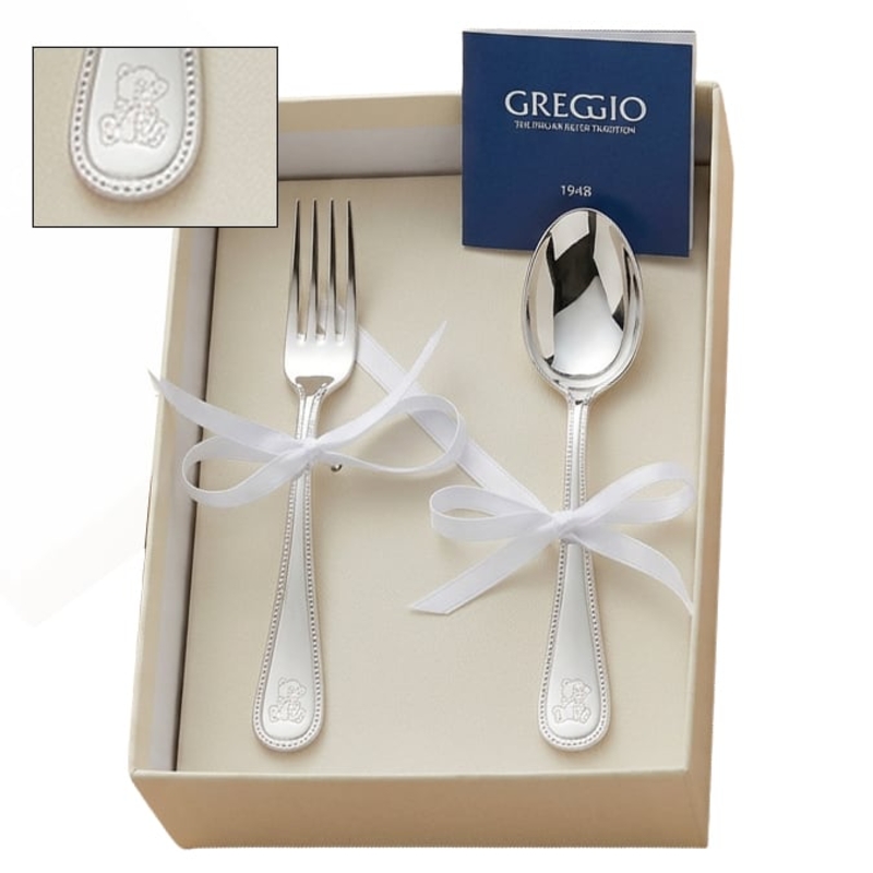 Deze prachtige 2-delige verzilverde kinderbestekset in het klassieke model parelrand en gegraveerd beertje, gemaakt door de ervaren zilversmeden van Greggio in Italië, straalt pure elegantie uit. Met zijn subtiele, sierlijke bewerking en hoogwaardige verzilvering op basis 100 is dit kinderbestekje een prachtig geboortecadeau. De set bestaat uit een lepeltje en vorkje, beide 14,7 cm lang, perfect voor kleine kinderhandjes. Geleverd in een luxe geschenkdoos, is het een tijdloos cadeau voor bijzondere momenten, zoals een geboorte- of doopfeest.