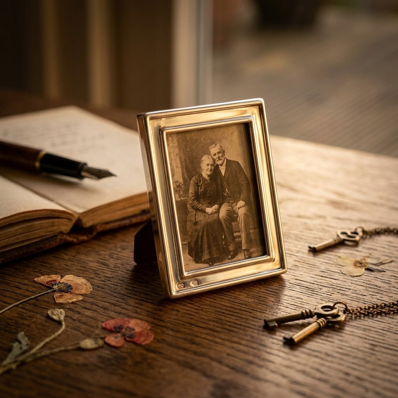 Het zilveren montuur is gemonteerd op een hout look achterzijde die is voorzien van een stevige, uitklapbare standaard. Door de kleine afmeting is dit lijstje een ingetogen detail op een bureau of kast.