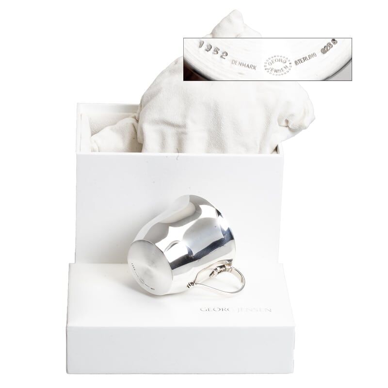 Een prachtige, handgemaakte 1e gehalte zilveren kinderbeker met oor in het iconische Acorn-model, vervaardigd door het gerenommeerde Deense huis Georg Jensen. Deze elegante beker is gebaseerd op een origineel ontwerp uit 1915 van de beroemde Deense architect en ontwerper Johan Rohde.