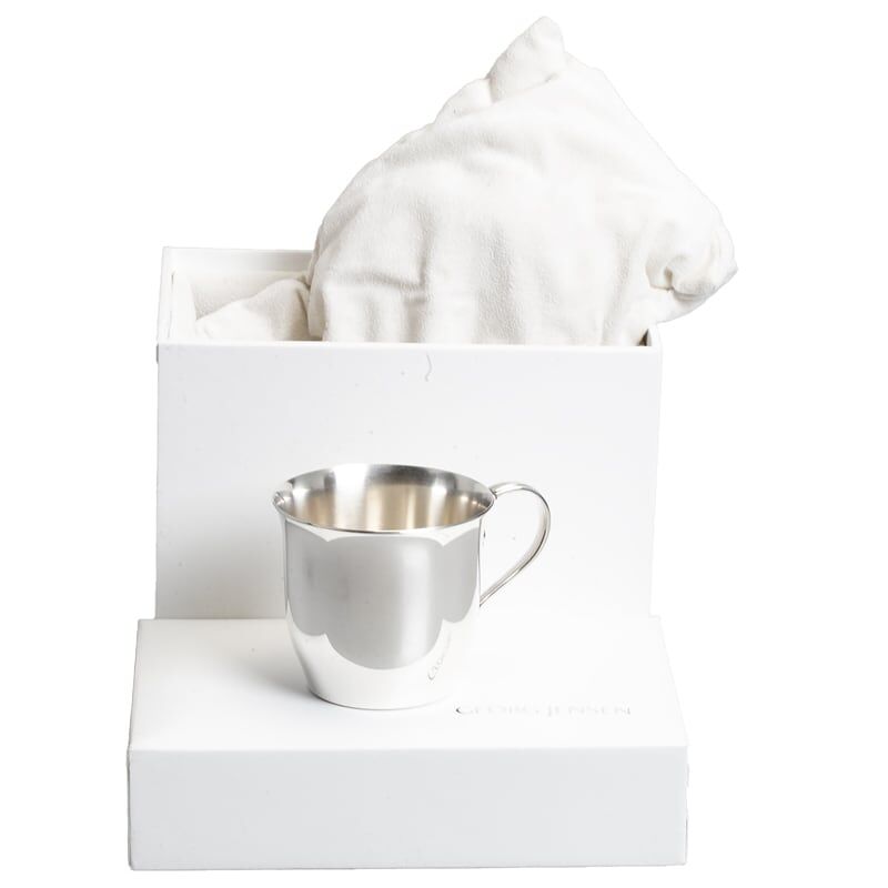 De stevige zilveren beker heeft een verfijnd oor in het kenmerkende Acorn-patroon, dat bekend staat om zijn tijdloze elegantie en subtiele art-nouveau invloeden. Het ontwerp combineert functionaliteit met esthetiek – perfect als blijvend geschenk voor een geboorte of doop.