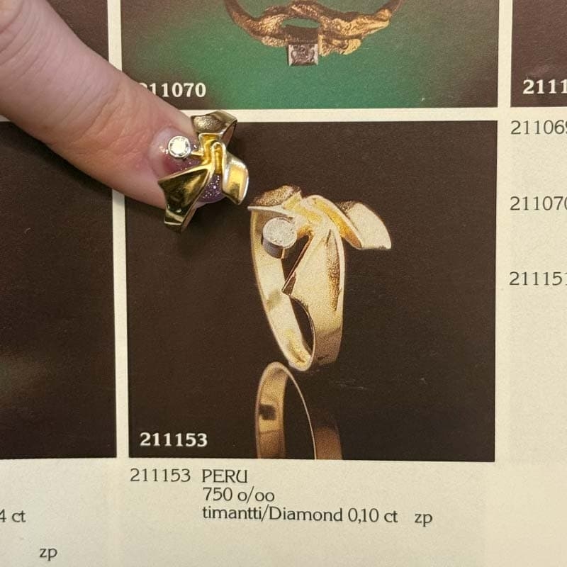 Deze bijzondere vintage Lapponia ring, model Peru, heeft een uitgesproken artistiek en modern ontwerp dat zich duidelijk onderscheidt van klassieke sieraden. Het creatieve, sculpturale design springt direct in het oog en maakt de ring tot een stijlvol statementstuk. De ring is bezet met een subtiele maar schitterende diamant, waardoor het geheel een verfijnde en elegante uitstraling krijgt.