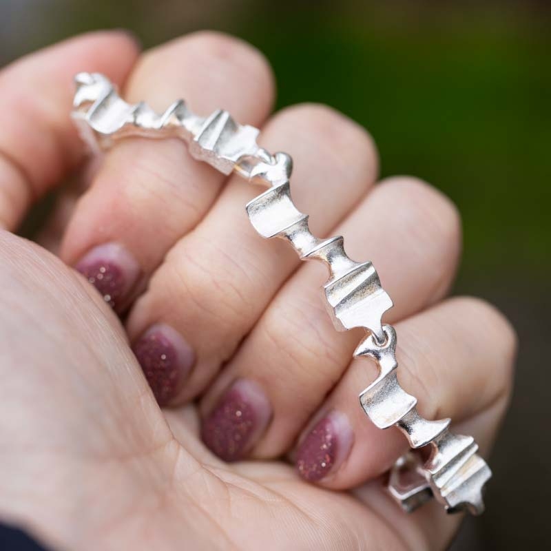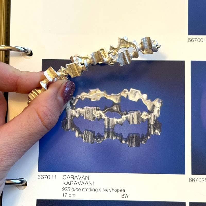 Prachtige zilveren Lapponia armband, model Caravan, ontworpen door de bekende Finse designer Björn Weckström. Een uniek en artistiek sieraad voor liefhebbers van Scandinavisch design. Het sculpturale ontwerp is typisch voor Weckström en geeft de armband een kunstzinnige, herkenbare uitstraling. Subtiel maar opvallend genoeg om elke outfit te versterken.
