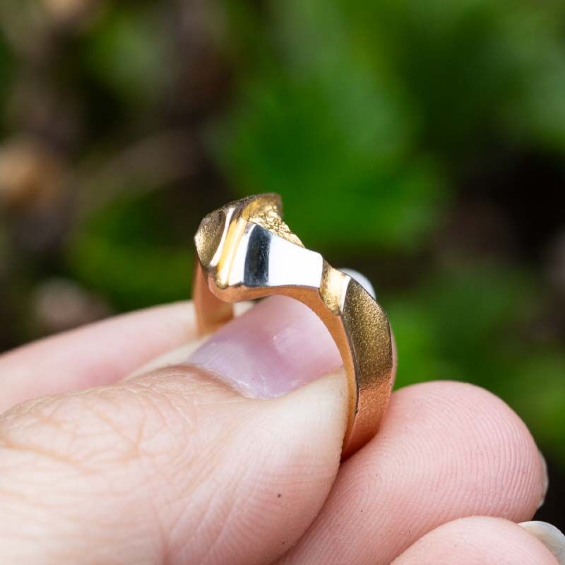 Vintage 14 karaat gouden ring van het merk Lapponia. Deze unieke ring is gemaakt in het jaar 1994 en heeft een opvallend ontwerp dat meteen de aandacht trekt.