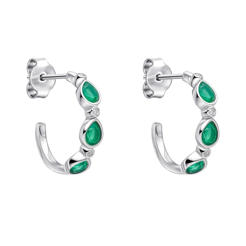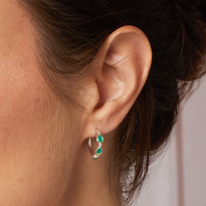De oorbellen Thornage Flowers zijn uitgevoerd als steekcreolen in zilver en komen uit de collectie van Laura Ashley. Aan de voorkant heeft elke creool drie druppelvormige stenen van groen chalcedoon, gecombineerd met drie kleine zirkonia’s. De creolen sluiten met pussets, wat ze prettig maakt voor dagelijks dragen en geschikt voor een veilige, stabiele passing op de oorlel.