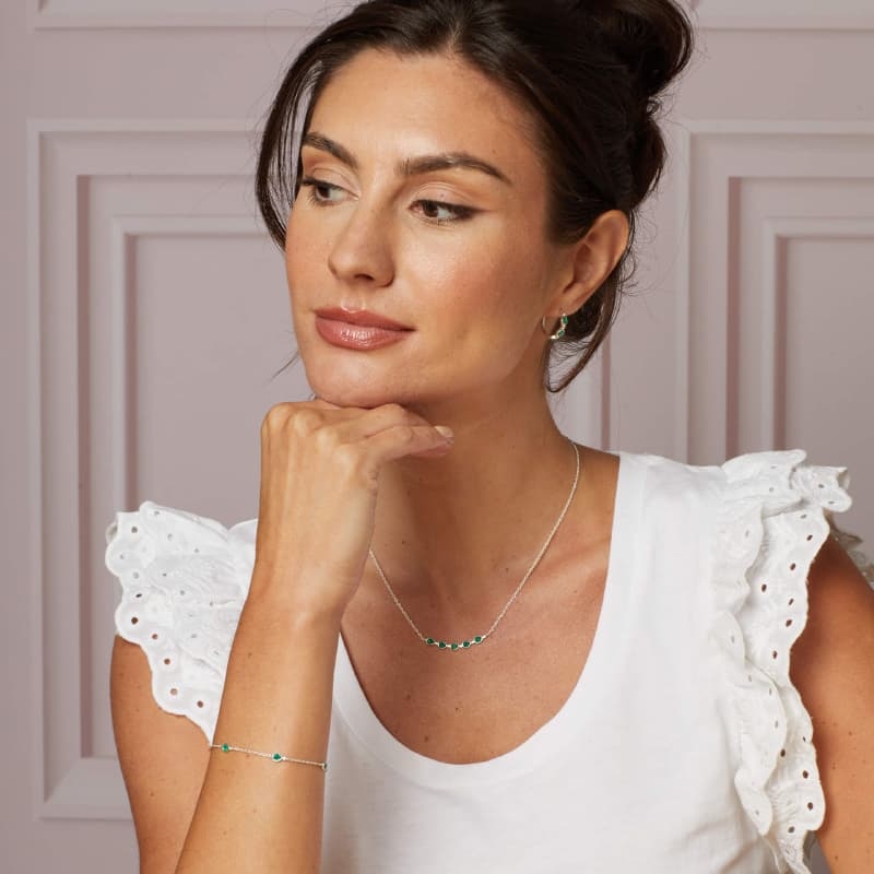 Het basis-materiaal is 1e gehalte zilver (925). De groene chalcedoon is in druppelvorm geslepen; chalcedoon is een kwartsvorm die vaak gekozen wordt om zijn egale kleur en zachte glans. De zirkonia’s zijn kleine, kleurloze steentjes die in sieraden veel worden gebruikt als helder accent naast een kleursteen.