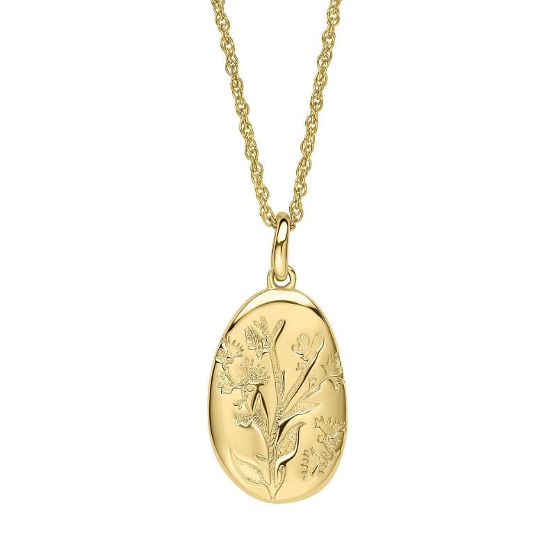 De ketting is gemaakt van verguld sterling zilver. De organische hanger heeft een licht reliëf met fijne bloemetjes en blaadjes, waardoor het sieraad rijk oogt maar toch perfect draagbaar is voor elke dag.