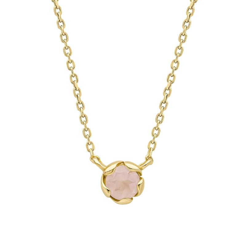 De hanger lijkt op een open bloem met fijne blaadjes. In het midden zit een edelsteen die zacht wordt “vastgehouden” door de bloembladzetting. Daardoor valt het licht mooi op de steen en krijgt de ketting een subtiele glans. Het resultaat is vrouwelijk, zacht en toch opvallend genoeg om je outfit nét dat extra’s te geven.