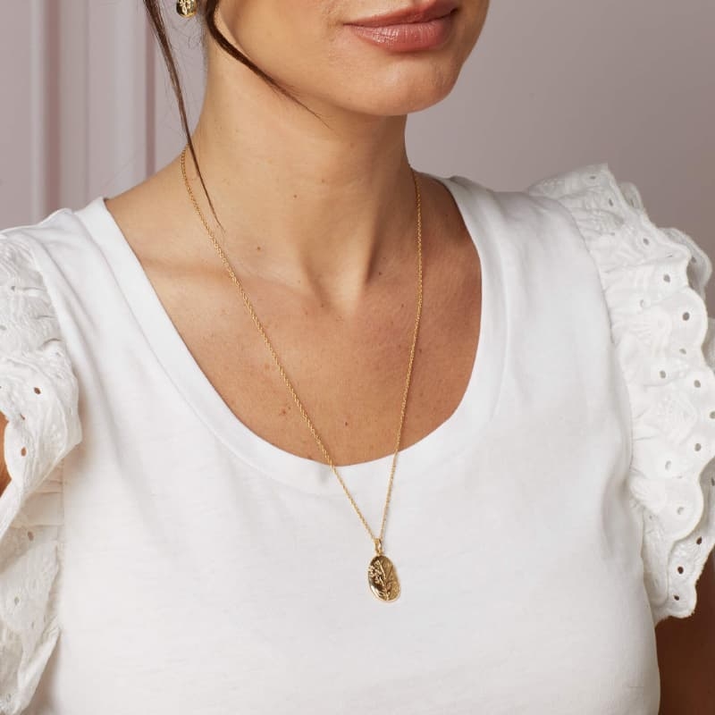 De ketting is gemaakt van verguld sterling zilver. De hanger heeft een organische vorm en een licht reliëf, met fijne bloemetjes en blaadjes die je ook van dichtbij goed ziet. Daardoor oogt het sieraad rijk en verfijnd, maar nog steeds heel draagbaar voor elke dag.