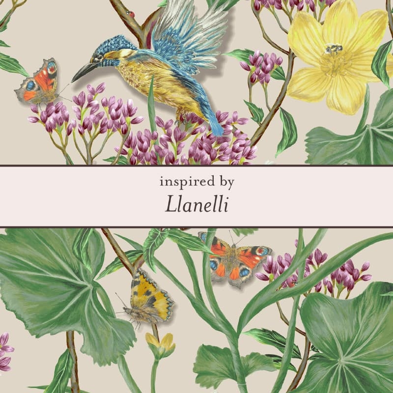 Deze ketting is geïnspireerd op de Laura Ashley Llanelli-print, vernoemd naar een stadje in Wales. Het ontwerp laat een elegante ijsvogel in vlucht zien. De vogel staat symbool voor vrijheid en schoonheid.