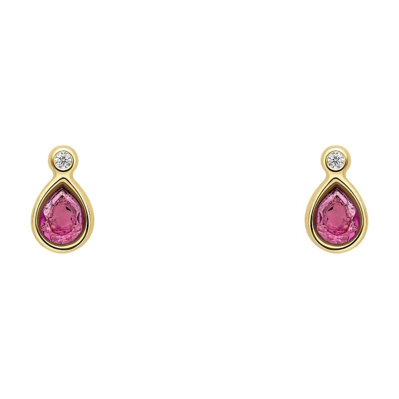Elke druppelvormige steen is een paarse rhodolietgranaat, met daarboven een witte zirkonia die zacht schittert. Samen zorgen ze voor een elegante mix van kleur en glans.