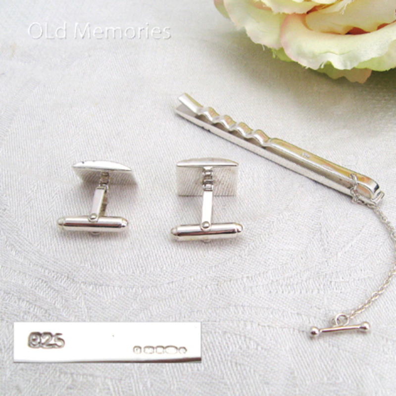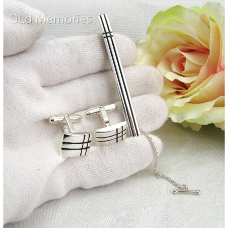 Deze exclusieve set bestaat uit een 1e gehalte zilveren dasschuif en bijpassende manchetknopen, vervaardigd door het gerenommeerde merk Carrs uit Sheffield, Engeland. De dasschuif meet 7 cm lang bij 0,55 cm breed en de ornamenten van de manchetknopen zijn elk 1,5 x 1,2 cm groot. Beide zijn prachtig afgewerkt met subtiele streepjes die gevuld zijn met zwart emaille voor een stijlvolle uitstraling. Deze nieuwe set wordt geleverd in een luxe geschenkdoos – perfect als cadeau of om je eigen formele garderobe compleet te maken.