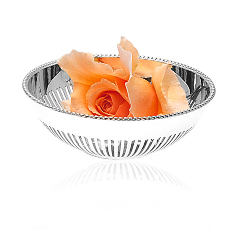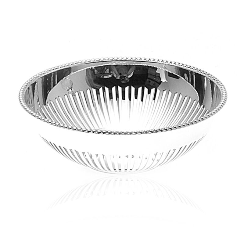 Rond opengewerkt verzilverd bonbonschaaltje afgezet met een parelrand Keltum, juweliersrestant in nieuw staat, geleverd in een geschenkdoosje. De diameter van het elegante mandje is 11,5 cm en het is 4 cm hoog.