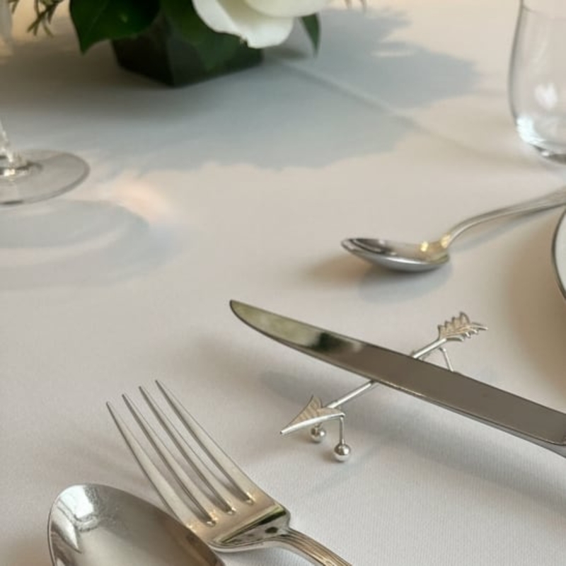 Een messenlegger (ook wel messensteun) wordt gebruikt om het mes tussen gangen door hygiënisch en netjes van het tafelkleed af te houden. Je legt het mes na gebruik op de messenlegger, zodat het lemmet de tafel niet raakt en er geen vlekken of kruimels op het linnen achterblijven. Messenleggers worden traditioneel per couverts gebruikt en dragen bij aan een verzorgde, formele tafelpresentatie.