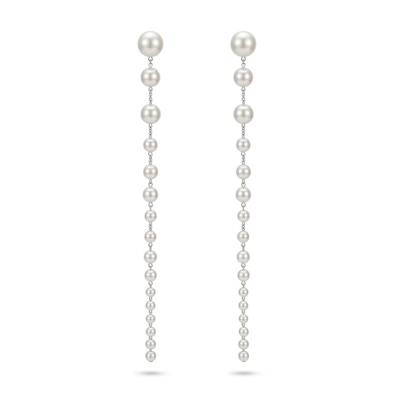 Deze opvallend lange oorstekers van eerste gehalte zilver zijn bezet met witte crystal parels uit de collectie van MY iMenso. Het sieraad heeft een totale lengte van 12,3 centimeter, waarbij de bovenste en tevens grootste parel een diameter van 8 millimeter heeft. Door het gebruik van zilver en de aaneenschakeling van verschillende parelelementen ontstaat een sieraad dat over de volledige lengte beweeglijk is.