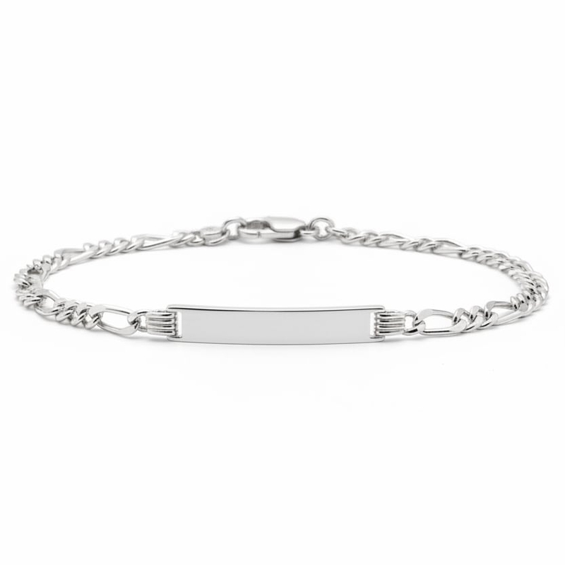 De armband is gemaakt van 925 zilver met figaroschakels en een centraal naamplaatje voor gravure van naam en geboortedatum, of een persoonlijke tekst. Let op, het graveerplaatje is 2,5 cm, des te meer tekens, des te kleiner de lettertjes, het moet natuurlijk nog wel goed leesbaar zijn.