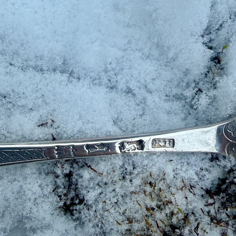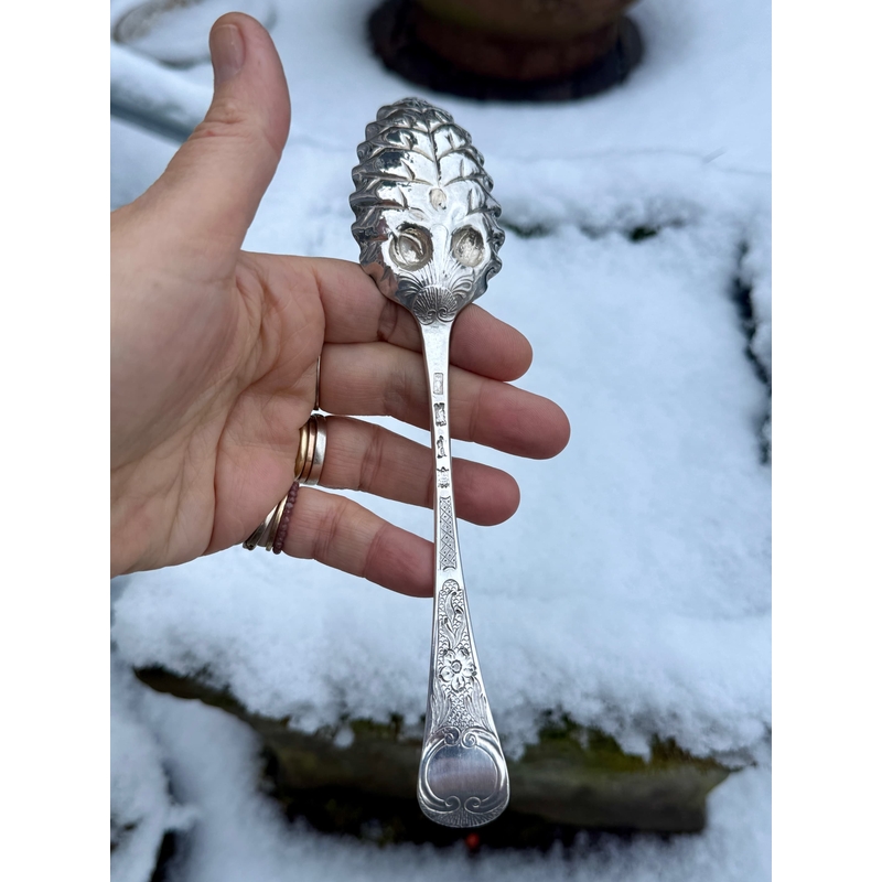 Prachtige 1e gehalte zilveren 'berry spoon' vruchtenlepel gemaakt in Londen in 1750, het meesterteken is RH. De zilveren lepel met een bladvormige bak is in uitstekende staat, de lepel is aan beide zijden heel mooi gegraveerd en bewerkt. De bladvormige bak stond symbool voor overvloed, vruchtbaarheid en beschaving. De lepel is 20,3 cm lang en de bak is 4,3 cm breed, hij weegt 53,9 gram. Aan de achterzijde van steel staan de duidelijke zilvermerken. De lepel is ruim 275 jaar oud!
