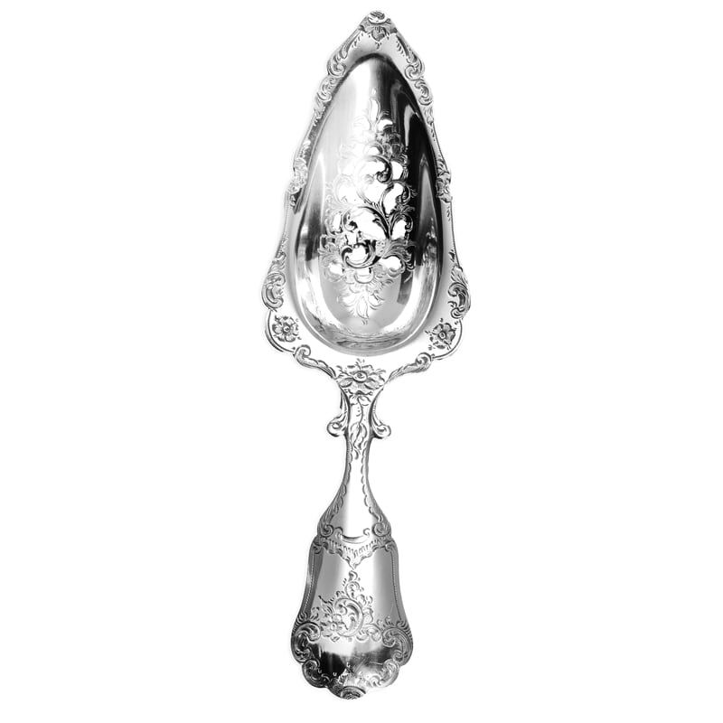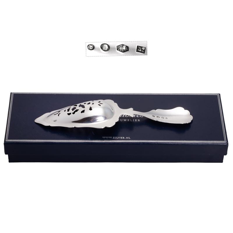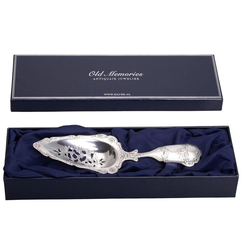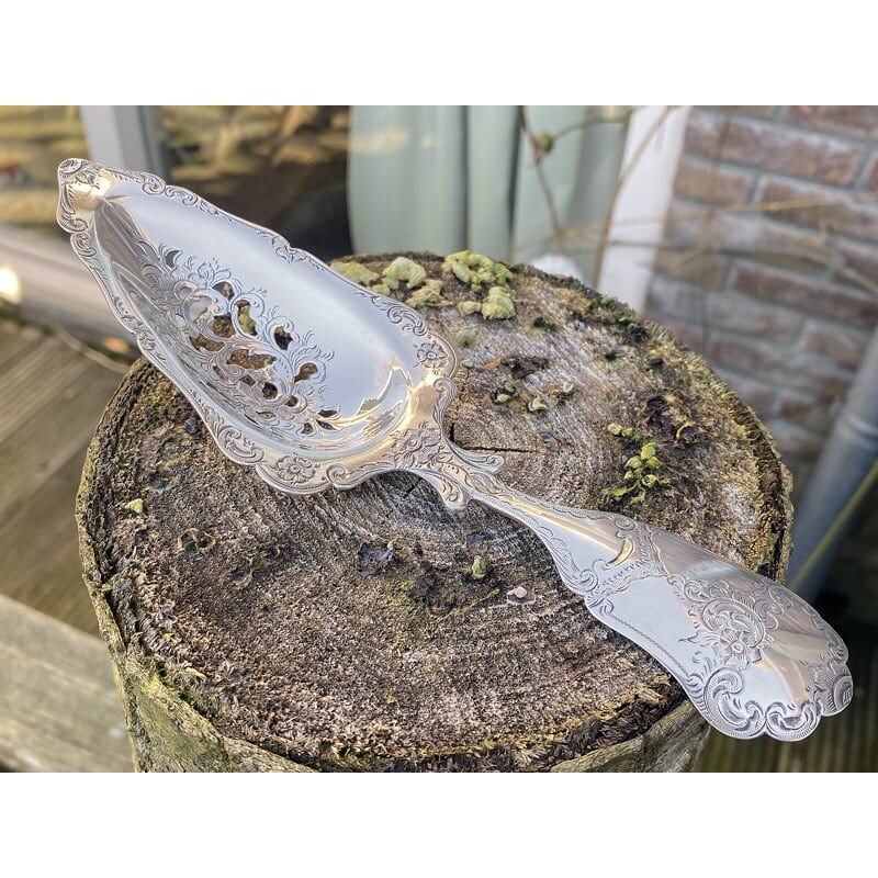 De zilveren natfruitschep is een ware blikvanger dankzij de stevige en zware constructie. De schep pronkt met een uitgezaagde bak, sierlijk verfraaid met fijne graveringen van bloem- en bladmotieven, wat het een uitzonderlijk stuk maakt voor zowel verzamelaars als liefhebbers van antiek. De graveringen zijn met uiterste zorg en precisie handgemaakt, waardoor elk detail tot zijn recht komt.