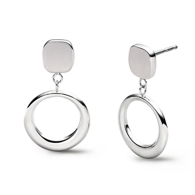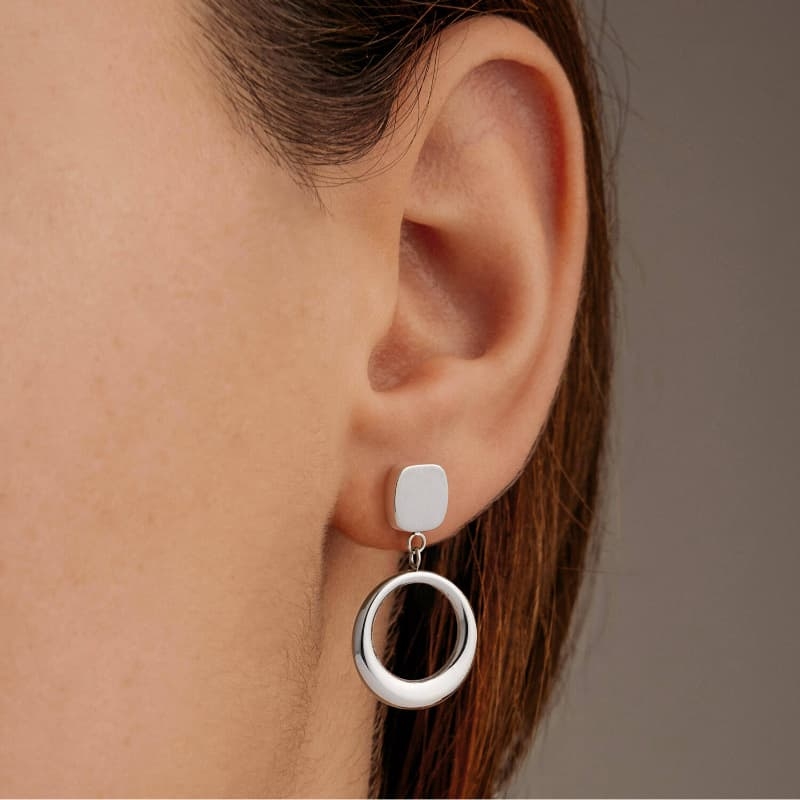 Een mooi spel van geometrie en beweging: deze Boccia oorstekers combineren een gematteerd vierkant op het oor met een open, ronde hanger die luchtig meezwaait. De oorbellen zijn uitgevoerd in titanium met een draaglengte van circa 2,7 cm en een cirkeldiameter van 1,5 cm hebben ze een elegant formaat dat direct opvalt zonder zwaar te worden.