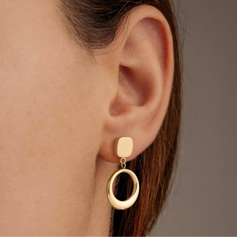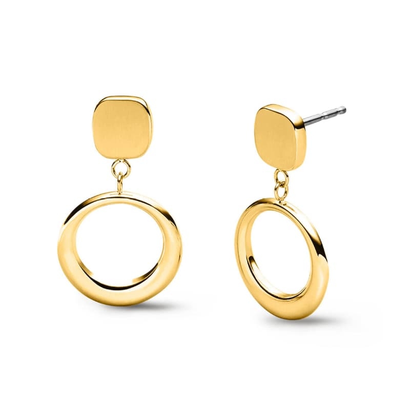 Een mooi spel van geometrie en beweging: deze Boccia oorstekers combineren een gematteerd vierkant op het oor met een open, ronde hanger die luchtig meezwaait. De oorbellen zijn uitgevoerd in titanium met een warme vergulde afwerking. Met een draaglengte van circa 2,7 cm en een cirkeldiameter van 1,5 cm hebben ze een elegant formaat dat direct opvalt zonder zwaar te worden.