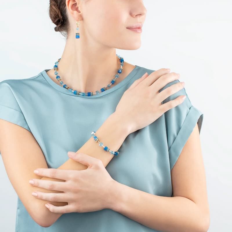 Frisse, zomerse oorbellen met turkoois blauwe kubussen uit de GeoCUBE collectie van COEUR de LION. De vergulde roestvrijstalen oorbellen zijn geregen met schitterende kristallen, synthetisch tijgeroog, strass rondellen, gecombineerd met verguld roestvrijstaal en zilverkleur roestvrijstaal. Lengte van de oorbellen is 4 cm, geschikt, dikte van de blokjes is 0,6 cm. De sluitingen zijn gemaakt van 1e gehalte, verguld zilver.