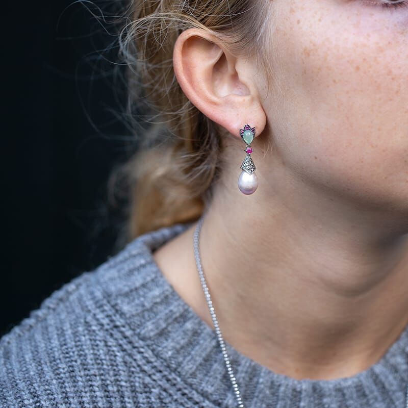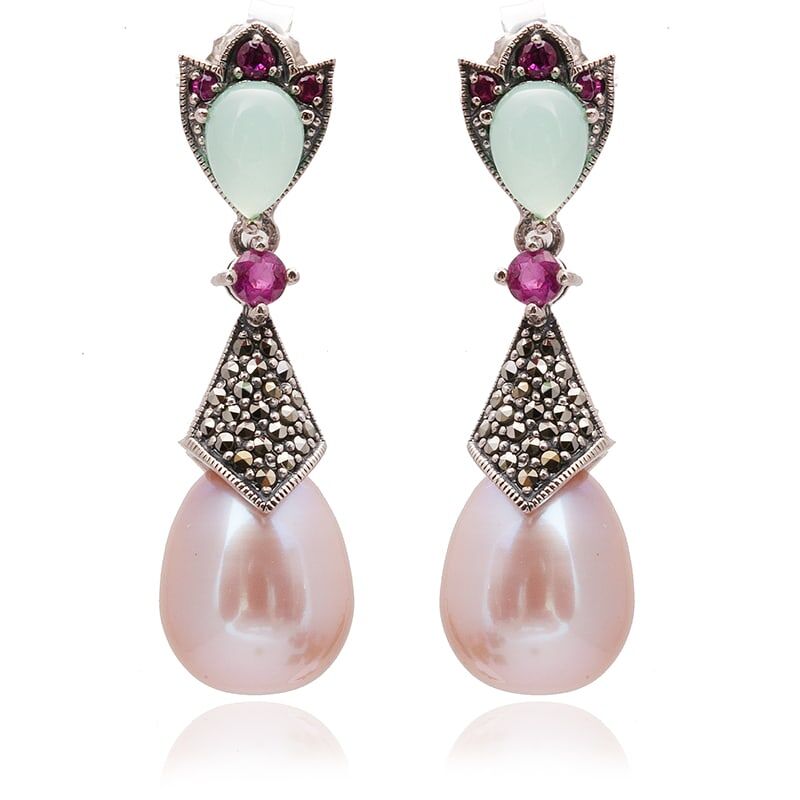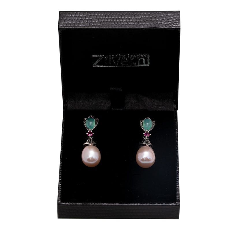 Chique zilveren oorbellen met chrysopraas, robijn en roze parel uit de Home Collection, nieuw in geschenkverpakking. De 1e gehalte zilveren (925) oorstekers bestaan uit een druppelvormige, roze zoetwaterparel gezet in een zilveren montuur dat aan de voor- en achterkant bezet is met markasietjes. Boven het zilveren montuurtje zit een robijntje, op het deel dat vast zit aan de oorstekers zit een druppelvormige chrysopraas (ondersteboven) in een zilveren montuur met in elke punt een robijntje.