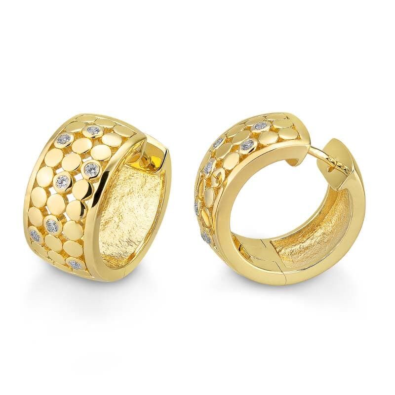 De voorkant van deze oorringen is opengewerkt met zorgvuldig uitgesneden cirkels die het ontwerp een speelse maar stijlvolle uitstraling geven. Enkele van deze cirkels zijn bezet met briljant geslepen diamanten, samen goed voor 0,28 karaat. De diamanten hebben zuiverheid si en kleur H (wit), wat garant staat voor schittering onder verschillende lichtomstandigheden.