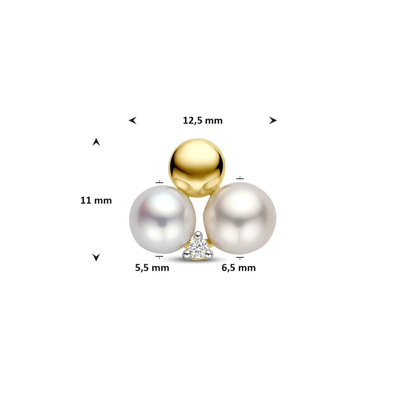 Deze hanger is gemaakt van 14k geelgoud en heeft een strak gepolijste finish. Compact van formaat, maar met genoeg detail om direct op te vallen. Bijpassende oorstekers zijn ook verkrijgbaar. Onder een klein gouden bolletje hangen twee witte zoetwaterpareltjes. Tussen de parels zit een briljant geslepen diamant van 0,02 ct, kleur H (wit), zuiverheid I2, gezet in een 3-poots chaton. De parels zijn wit en hebben een steenmaat van ca. 6,5 mm diameter.